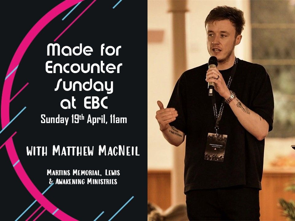 This Sunday is @madeforencounter Sunday at EBC. We are thrilled to have Matthew MacNeil preaching. ———————————————————- Matthew is the Youth Pastor at Martins Memorial Church and the founder of Awakening Ministries, a movement passionate about awakening young people and young adults to who they are and whose they are in Christ. Carrying a heart for revival, identity, and equipping and commissioning the next generation, Matthew ministers through Scotland across numerous avenues. He is honoured to be contributing @madeforencounter & speaking at EBC and is expectant for what God will do!